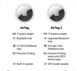A side-by-side comparison of the first-and-second generation of AirTags.The next generation of AirTag — the bestselling item finder — is even easier to locate with more powerful Precision Finding, a longer Bluetooth range, and a louder speaker. (Courtesy of Apple Inc.)Powered by the strength of the Find My network, AirTag allows users to keep tabs on their belongings every single day, from keys and wallets to backpacks, luggage, and more.Precision Finding guides users through haptic, visual, and audio feedback to their lost items from up to 50 percent farther away than the previous generation, and an updated Bluetooth chip expands the range at which items can be located.The new AirTag incorporates a suite of industry-first protections against unwanted tracking, including cross-platform alerts and unique Bluetooth identifiers that change frequently.
